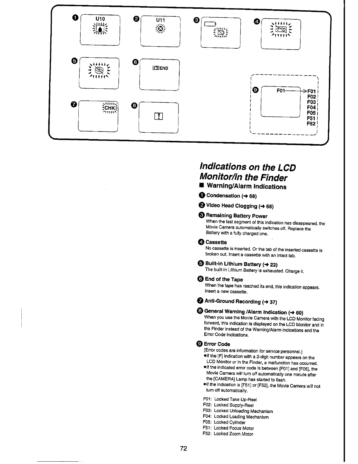 Panasonic NV-VX70A - Indications on the LCD Monitor;In the Finder; Warning;Alarm Indications; Error Code