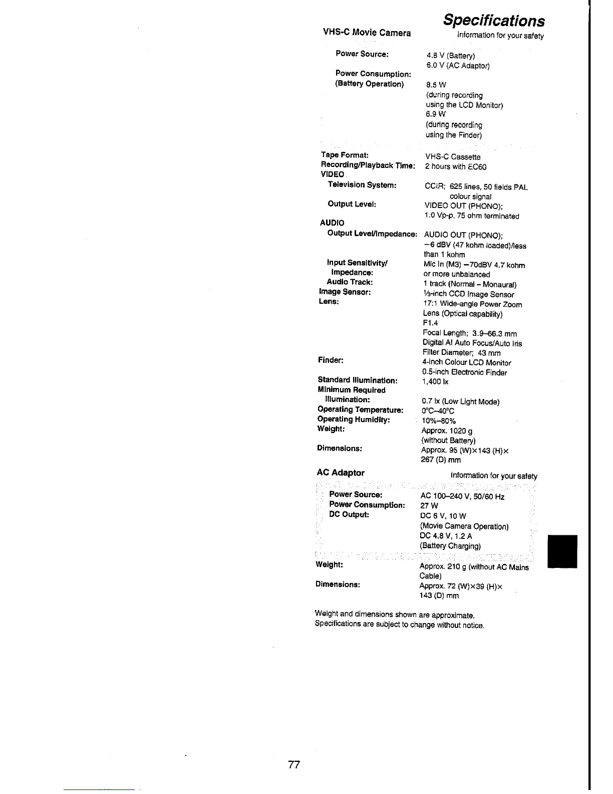 Panasonic NV-VX70A - Specifications