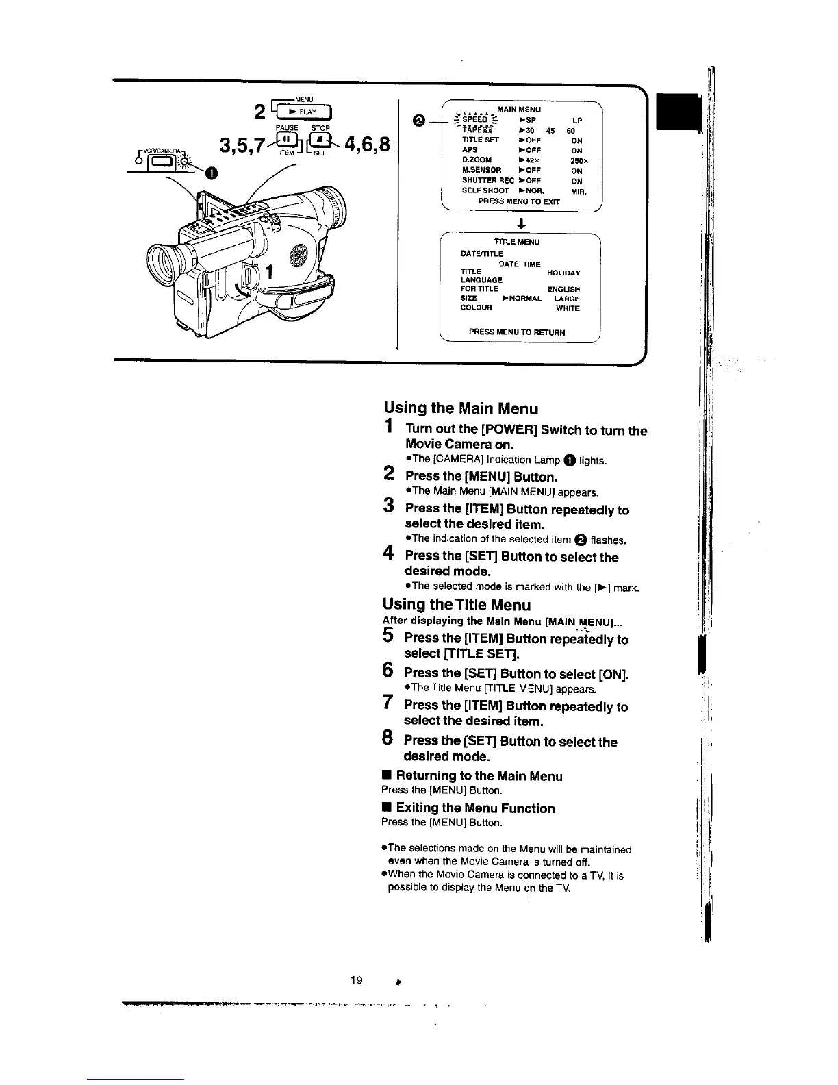 Panasonic NV-VX77A - Using the Main Menu; Using the Title Menu; Returning to the Main Menu; Exiting the Menu Function