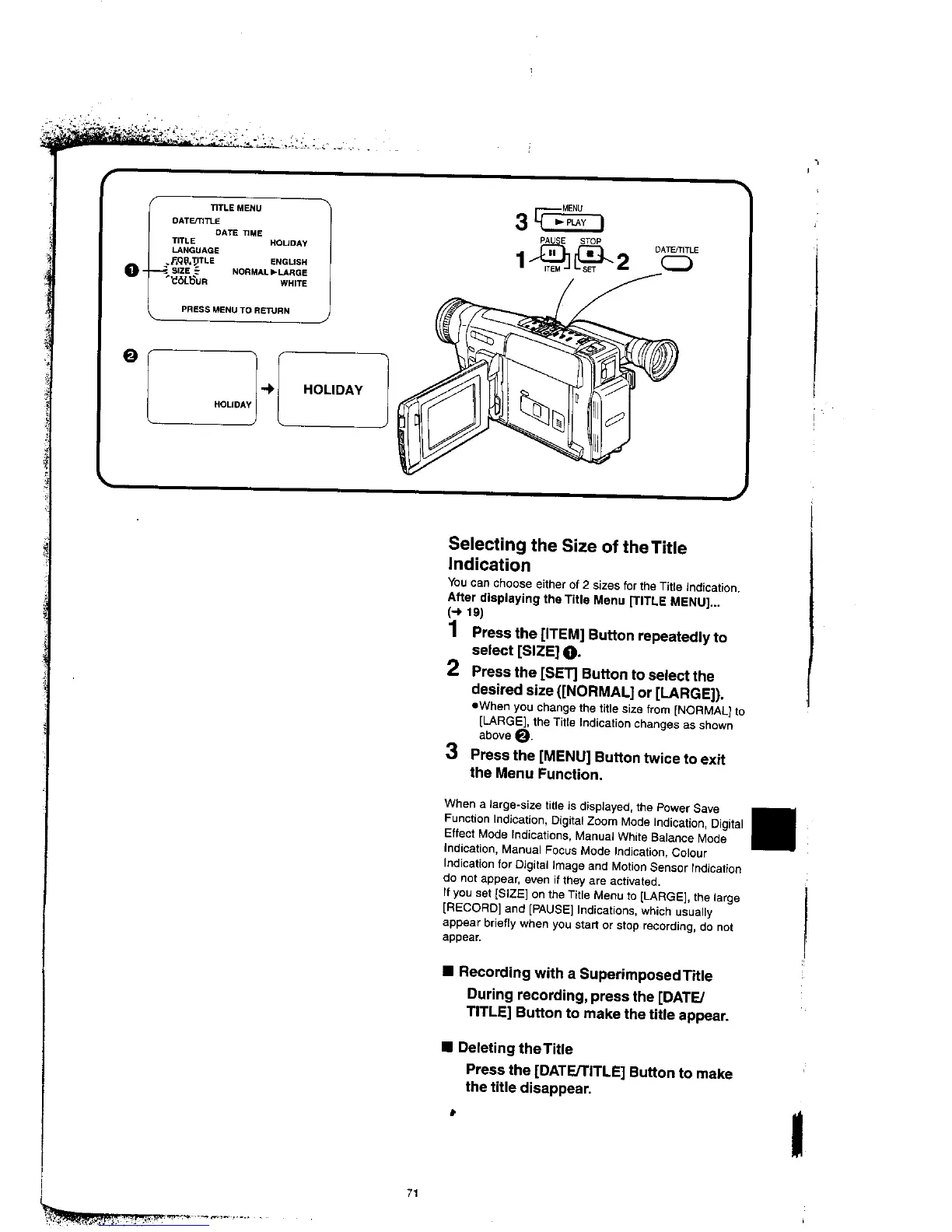 Panasonic NV-VX77A - Selecting the Size of the Title Function; Recording with a Superimposed Title