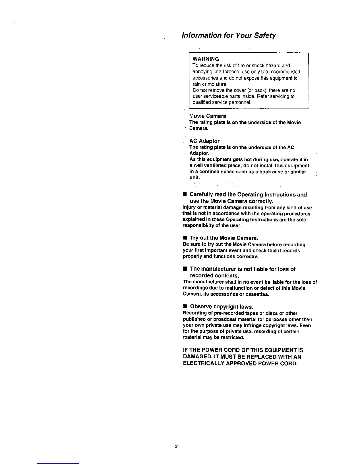 Panasonic NV-VZ1A - Safety Information; General Safety Precautions
