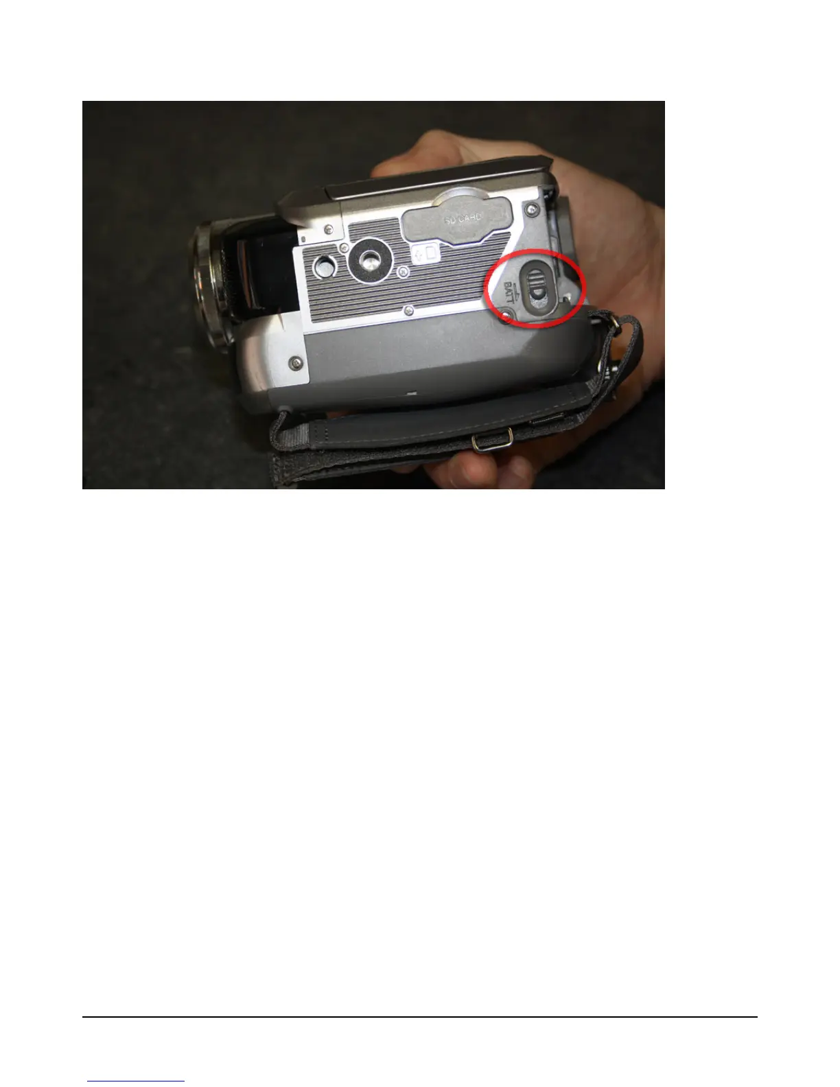bottom of video camera to side and remove mains power connector/ battery