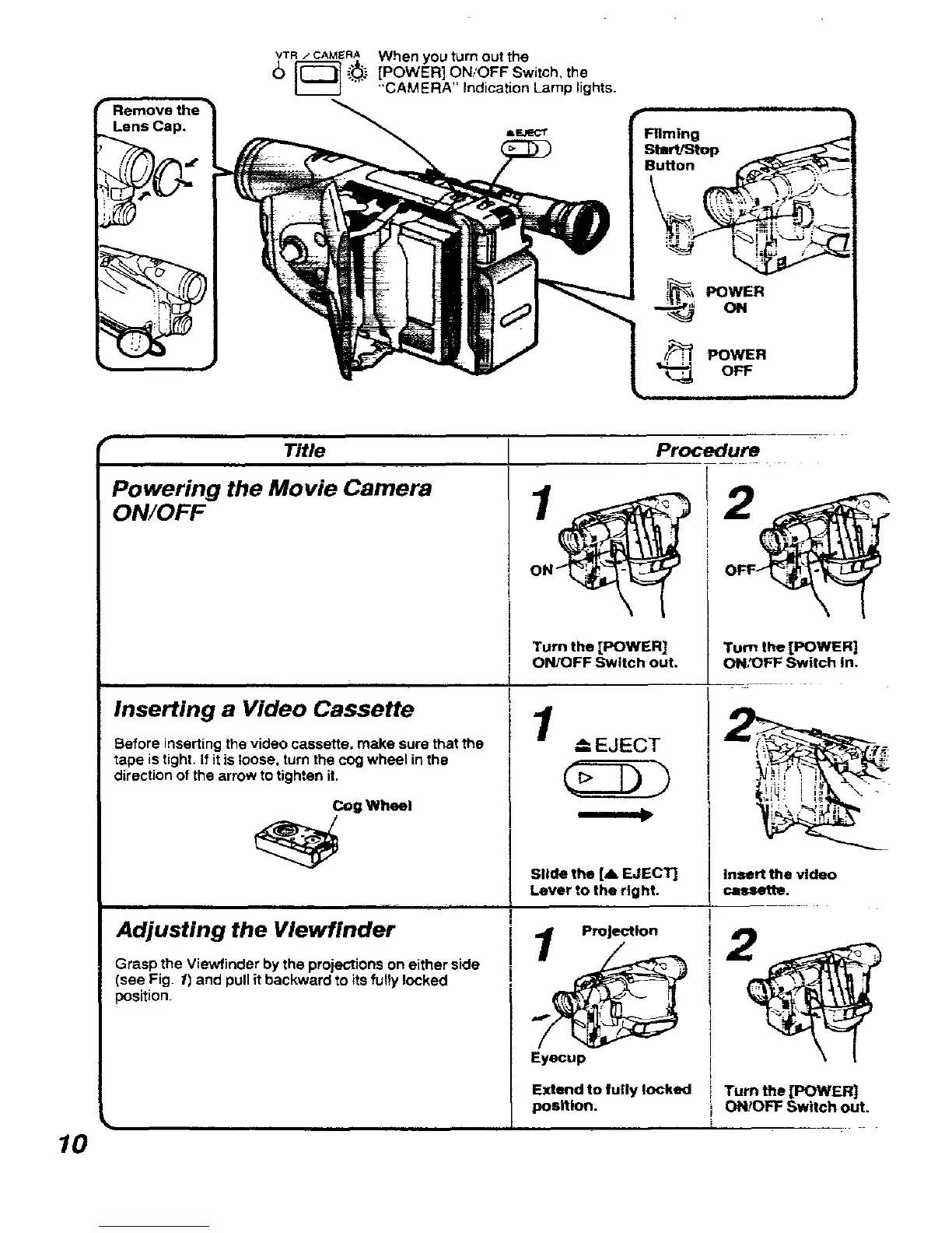 Panasonic NVR11 - Powering the Movie Camera ON;OFF; Inserting a Video Cassette; Adjusting the Viewfinder