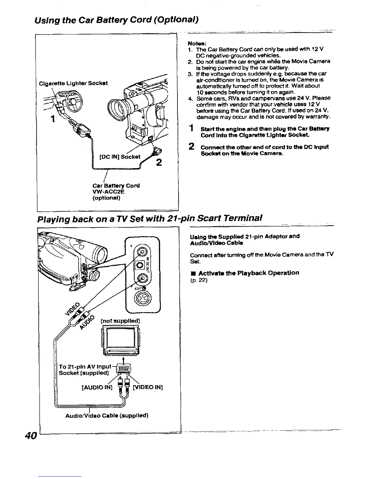 Panasonic NVR11 - Using the Car Battery Cord (Optional); Playing back on a TV Set with 21-pin Scart Terminal