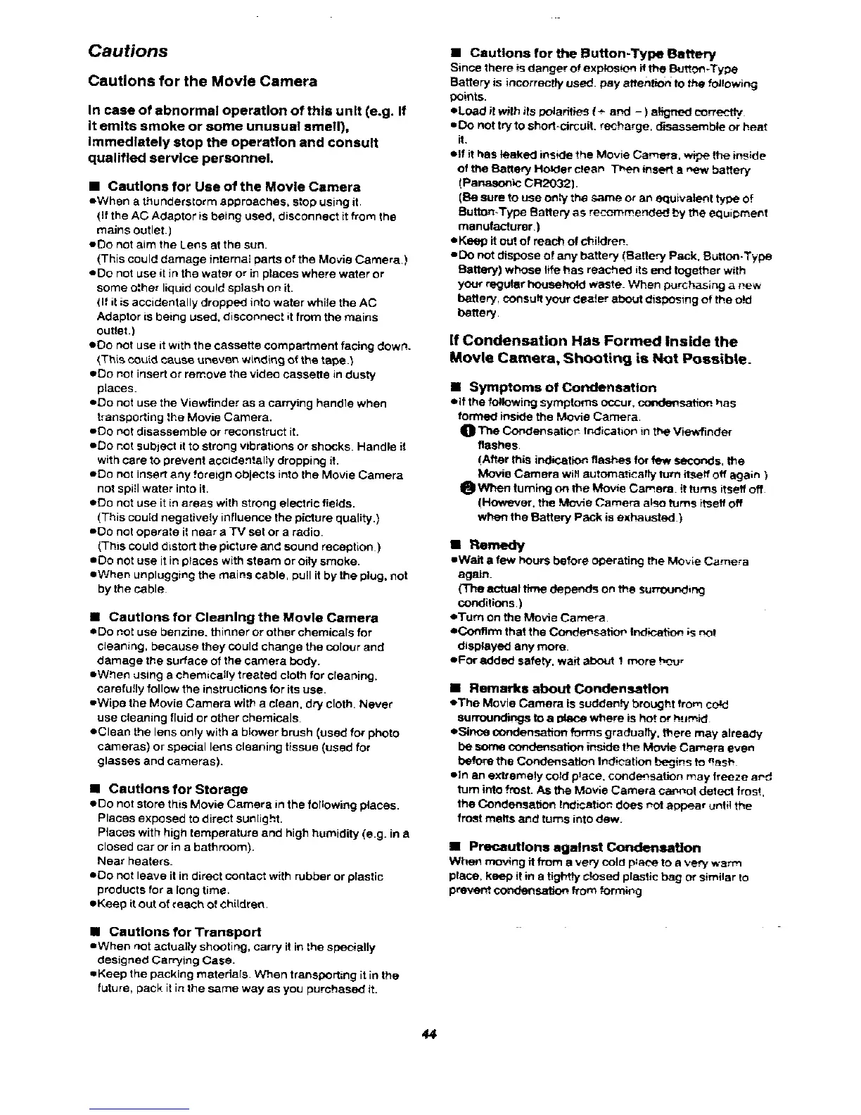 Panasonic NVRX50 - Cautions; General Camera Safety; Battery and Condensation Safety