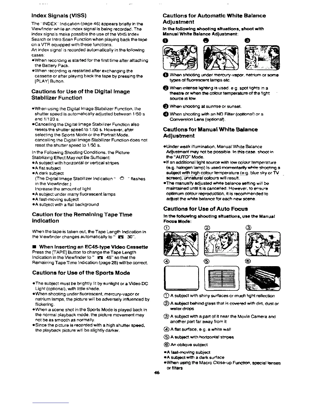 Panasonic NVRX50 - Index Signals; Cautions for Use of the Digital Image Stabilizer; Cautions for Use of Auto Focus