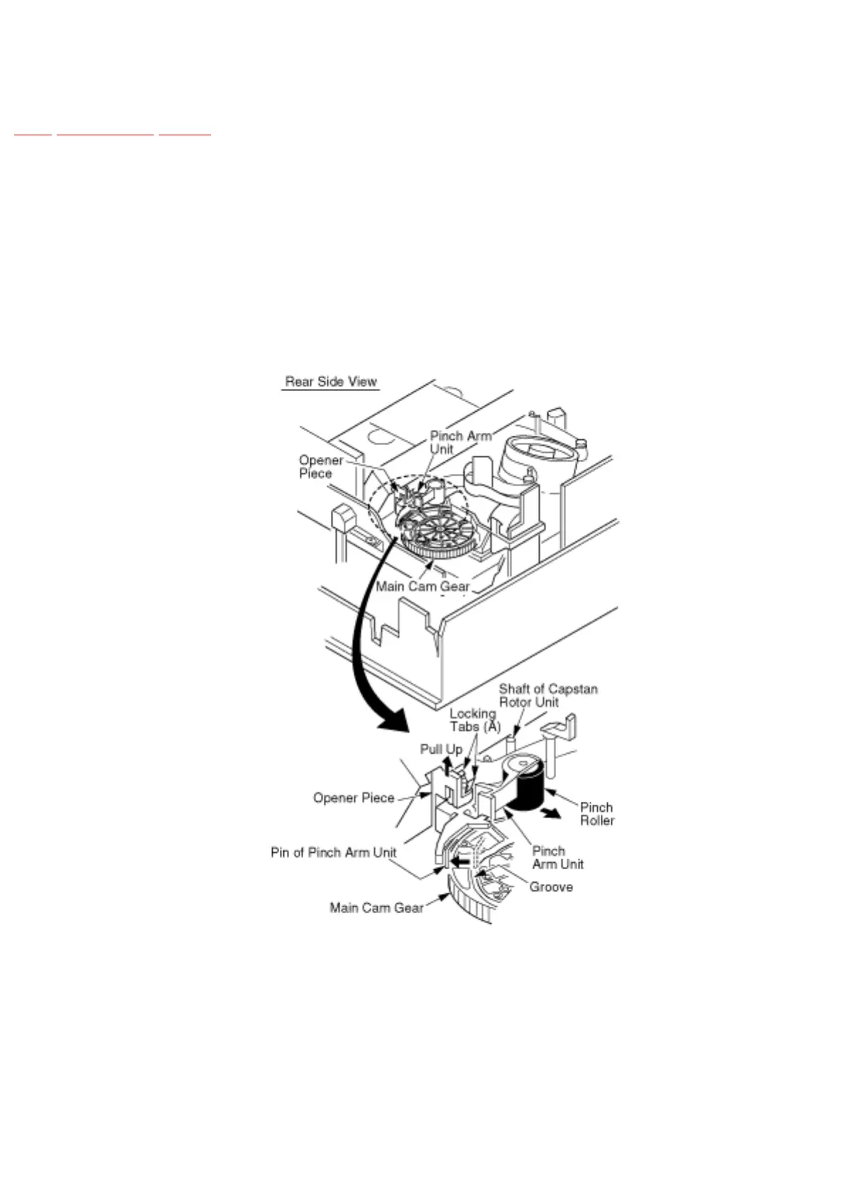 2. Move the pin of Pinch Arm Unit out of the groove of the Main Cam Gear so that the Pinch