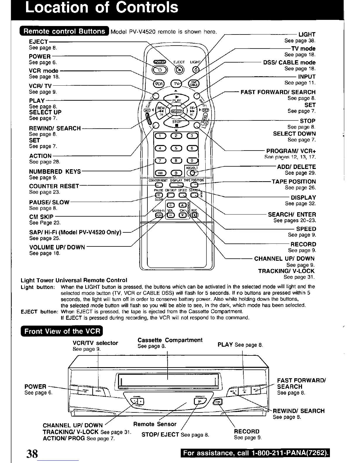 Panasonic Omnivision PV-V4520 - Location of Controls; Remote Control Buttons Overview; Light Tower Universal Remote Control; Front View of the VCR Controls
