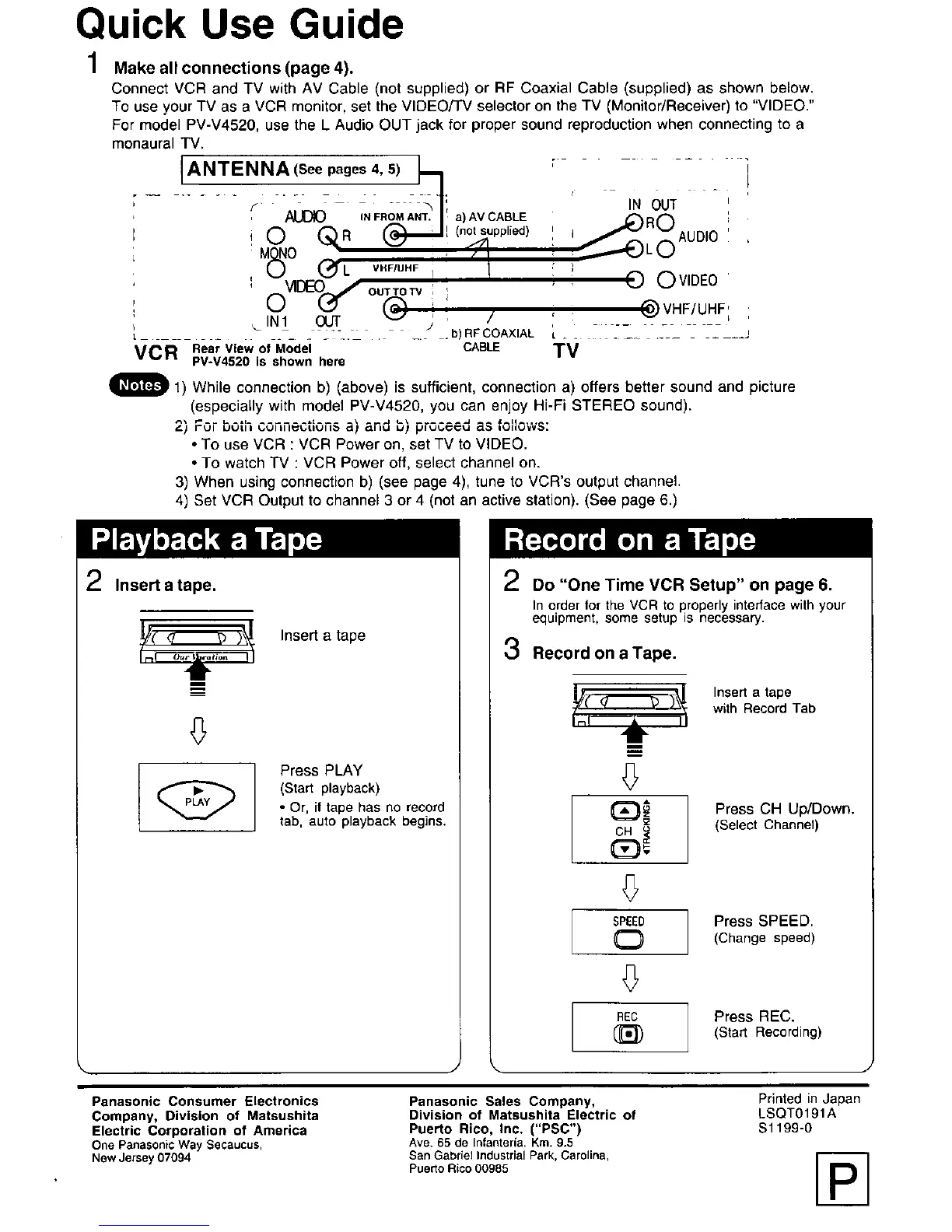 Panasonic Omnivision PV-V4520 - Quick Use Guide Summary; Quick Guide: Playback a Tape; Quick Guide: Record on a Tape