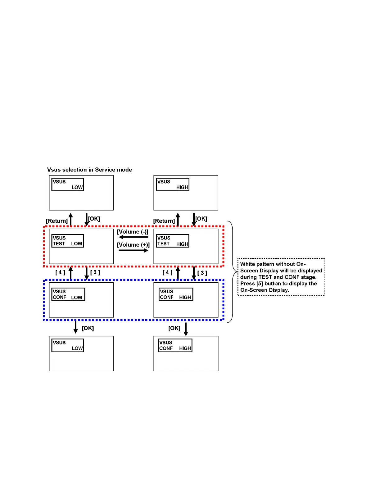 White pattern without On-Screen Display will be displayed during TEST and CONF stage. Press [5] button to display the