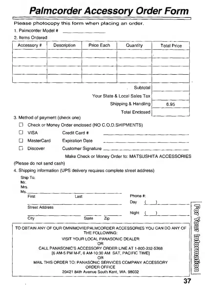 Panasonic Palmcoder PalmSight PV-L51 - Palmcorder Accessory Order Form