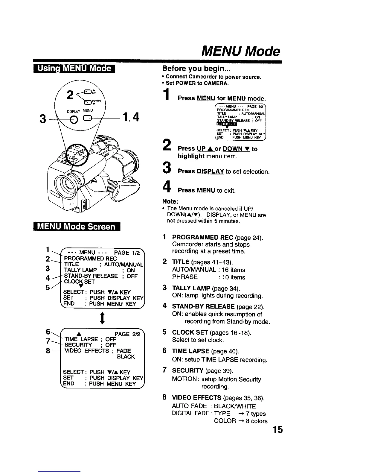 • The Menu mode is canceled if UP/