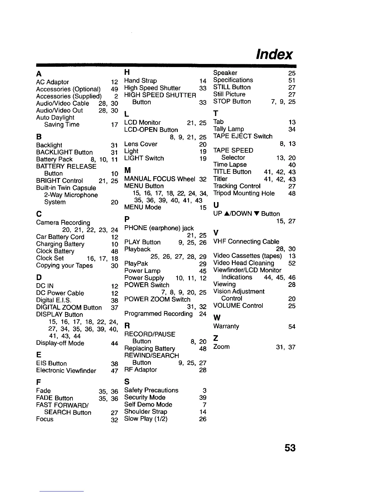 Panasonic Palmcoder Palmsight PV-L579 - Index