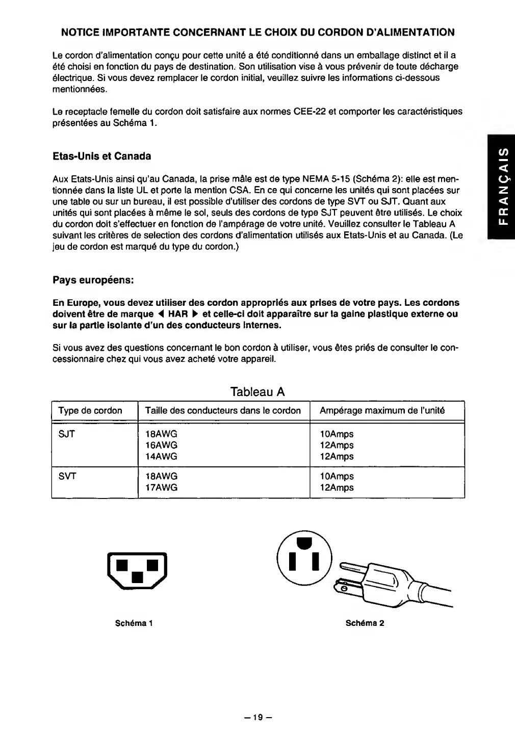 NOTICE IMPORTANTE CONCERNANT LE CHOIX DU CORDON D'ALIMENTATION