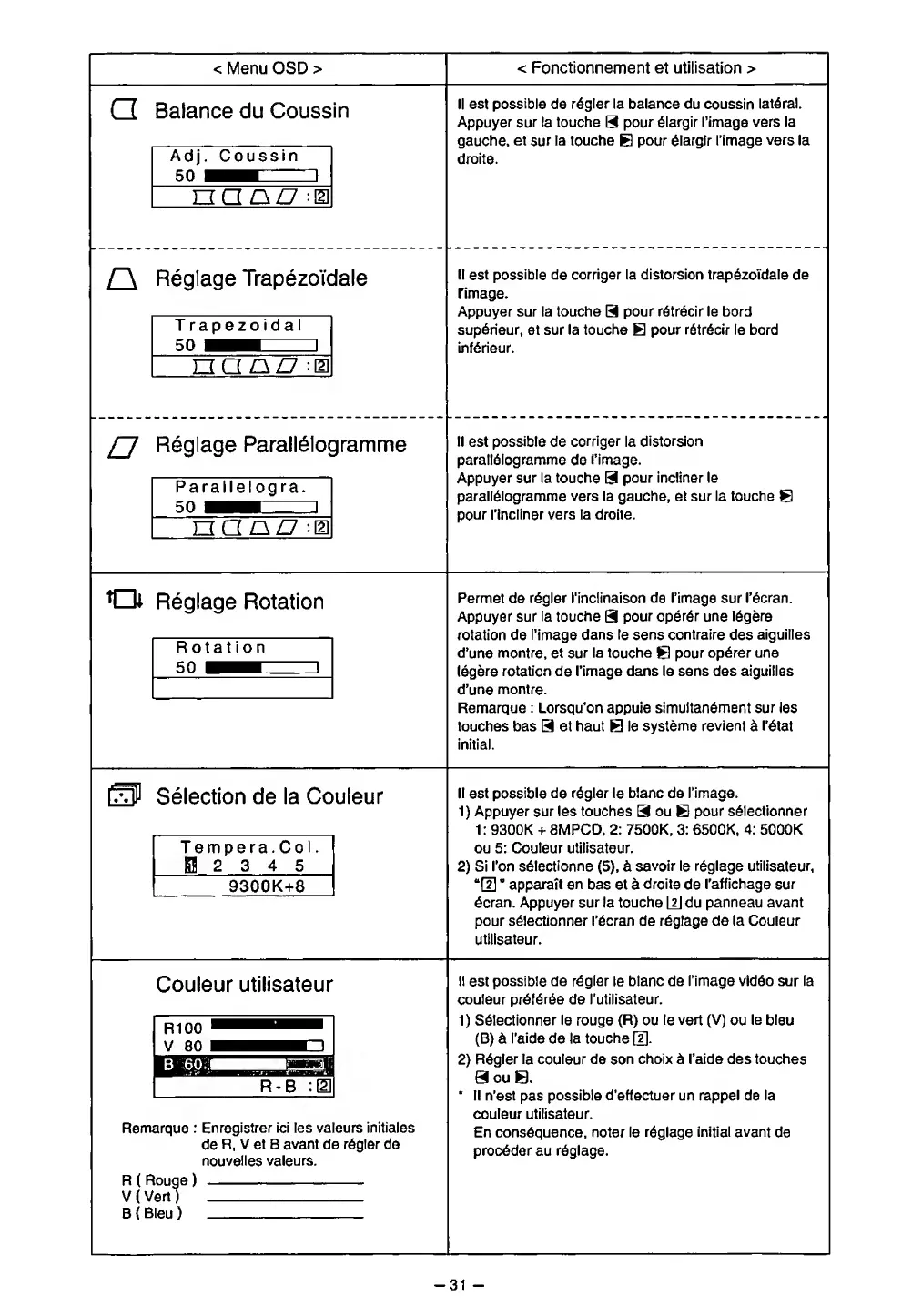 Permet de regler I'inclinaison de I'image sur