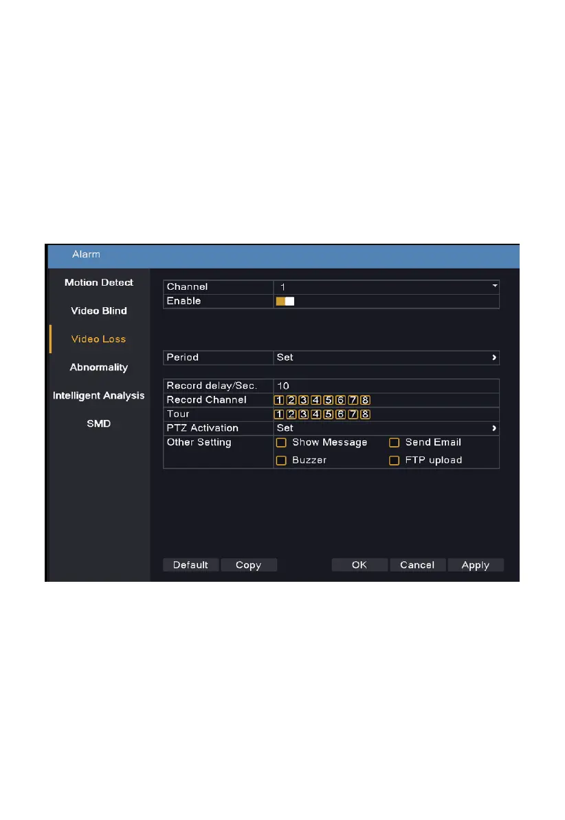 Once enabled a video loss alarm occurs when the camera is disconnected