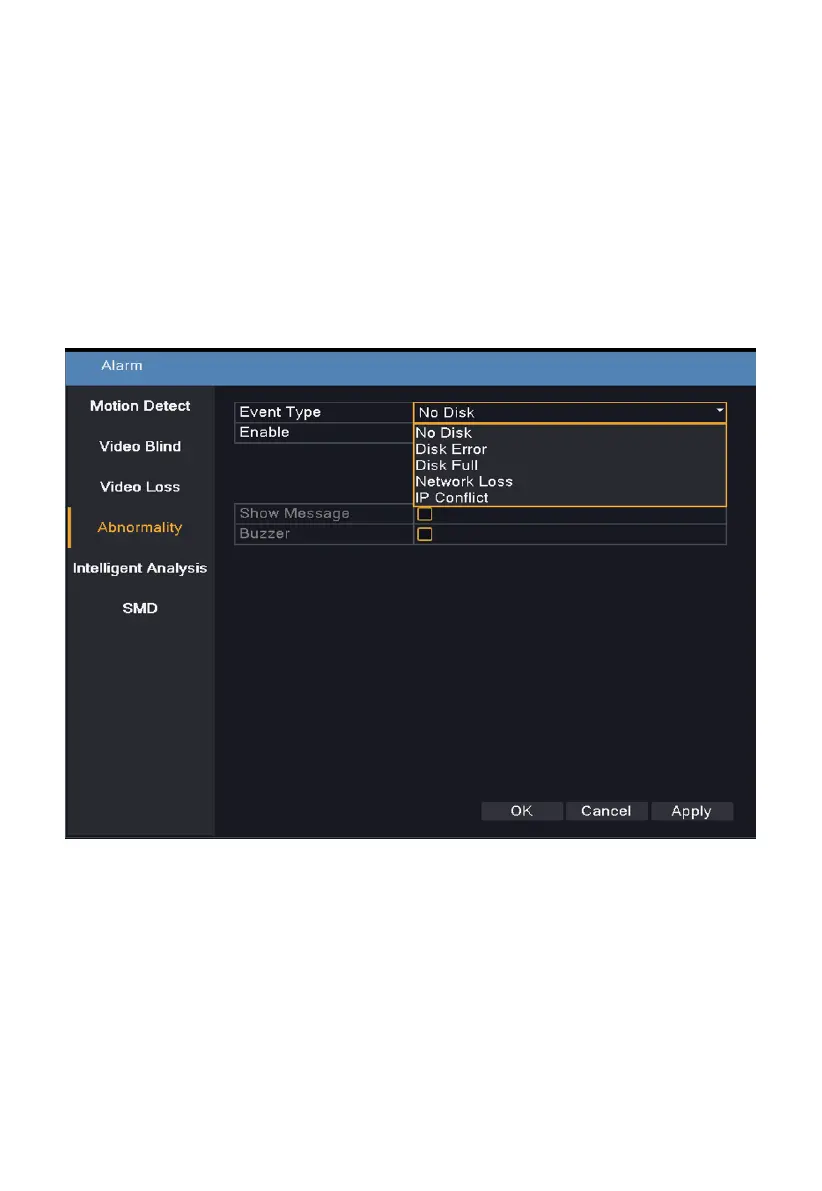 Error, Disk Full, Network Loss, IP Conflict detection. An alarm icon appears