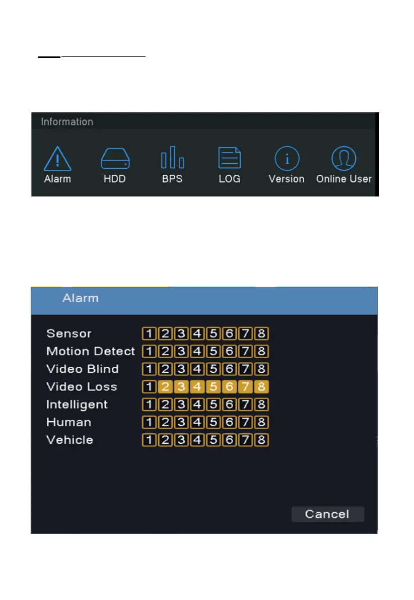 This provides details related to NVR like alarm, HDD, BPS, Logs, Version &