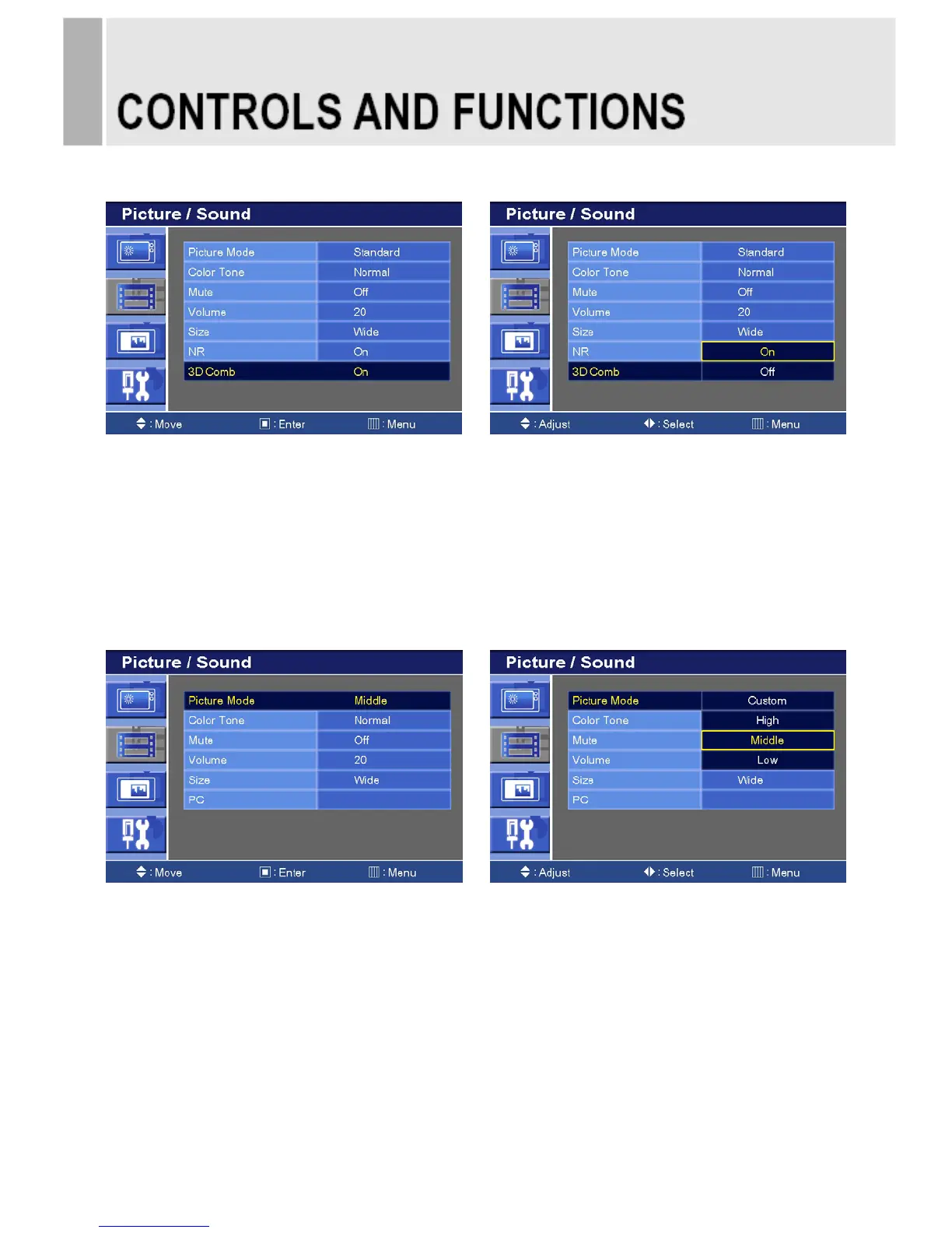 1) Press the MENU button and then press the up(▲) or down(▼) button to select the Picture/Sound.
