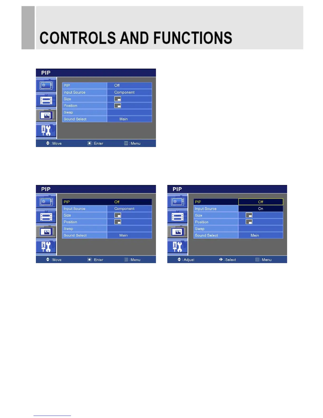 1) Press the MENU button and then press the up(▲) or down(▼) button to select the PIP.