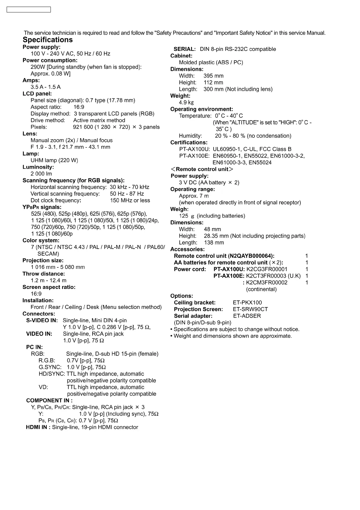 PT-AX100U / PT-AX100E