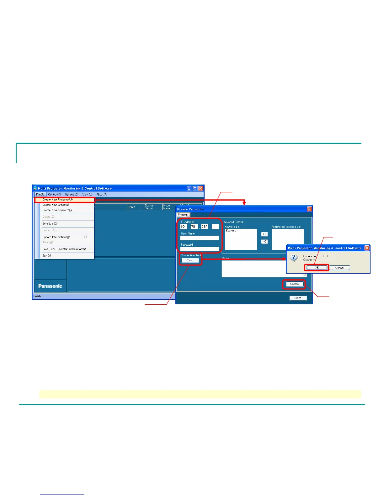 It is possible to register a projector without performing the connection test by clicking the Create button (5 in the above diagram).
