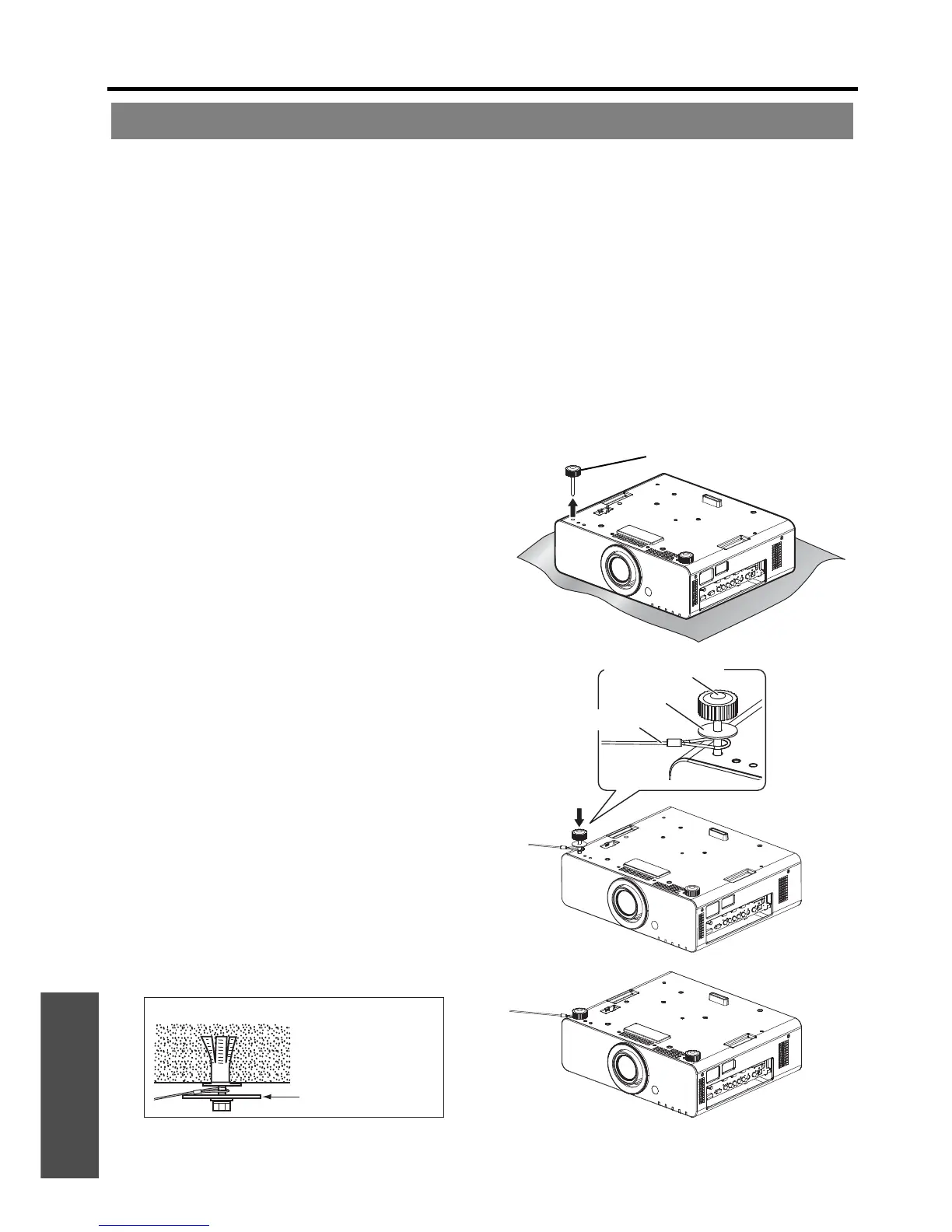 Do not use the screw holes of the front leg adjusters for the projector installation.