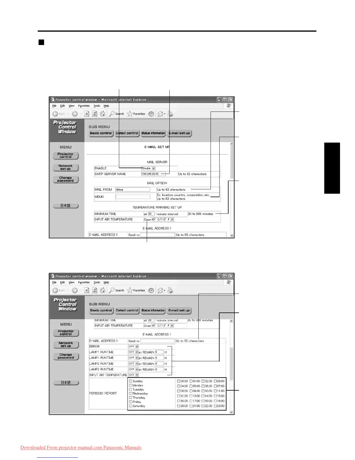 sent to one or more preset e-mail addresses (maximum two addresses). Click [Projector Control], then [E-mail