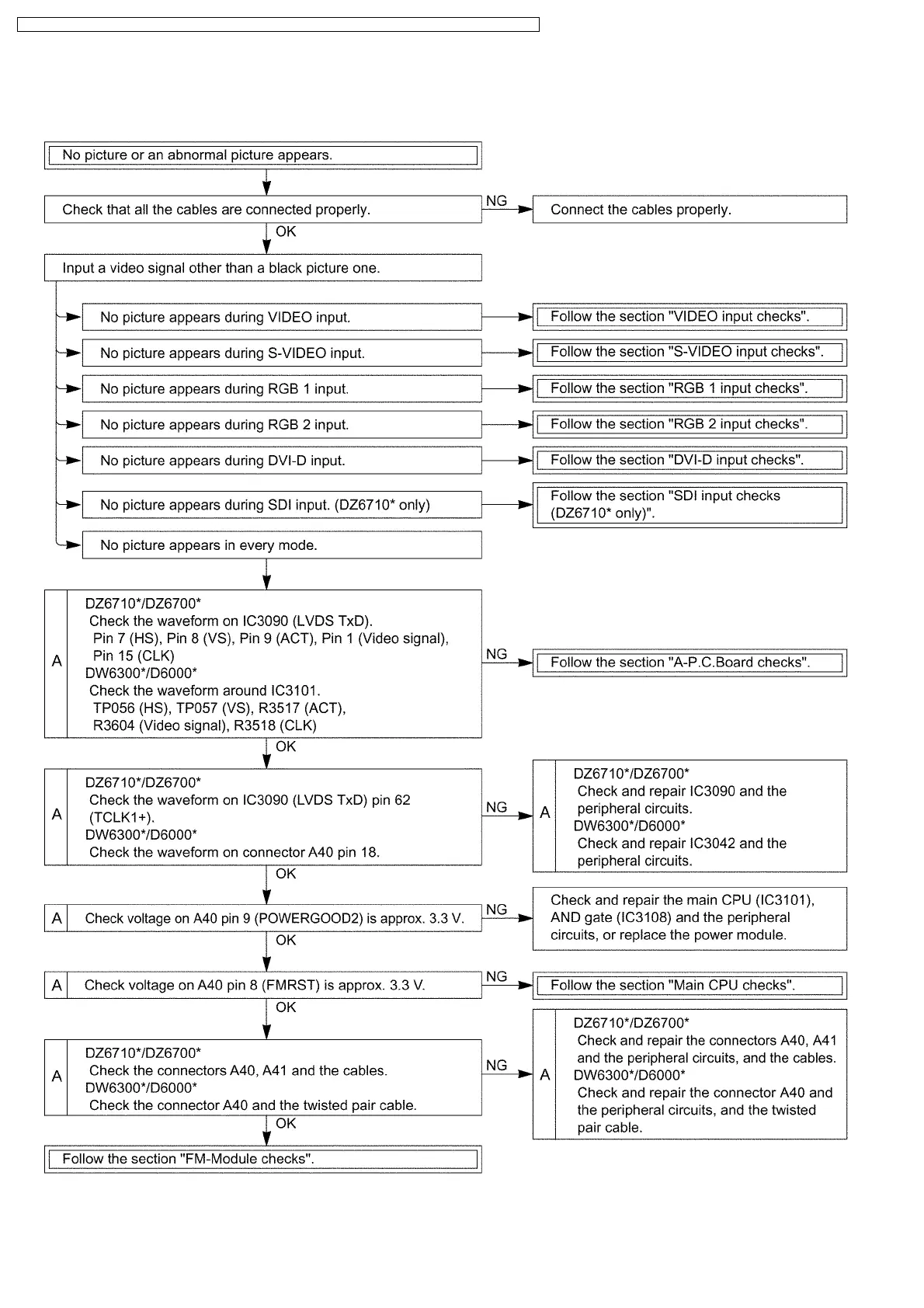 The alphabets (A, FM, etc.) in the left box of the inspection items indicate the names of P.C.Boards or modules to be checked.