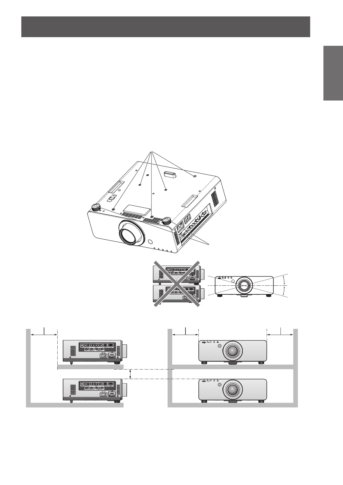 Make a clearance of at least 20 mm between the projector bottom and setting surface by inserting spacers