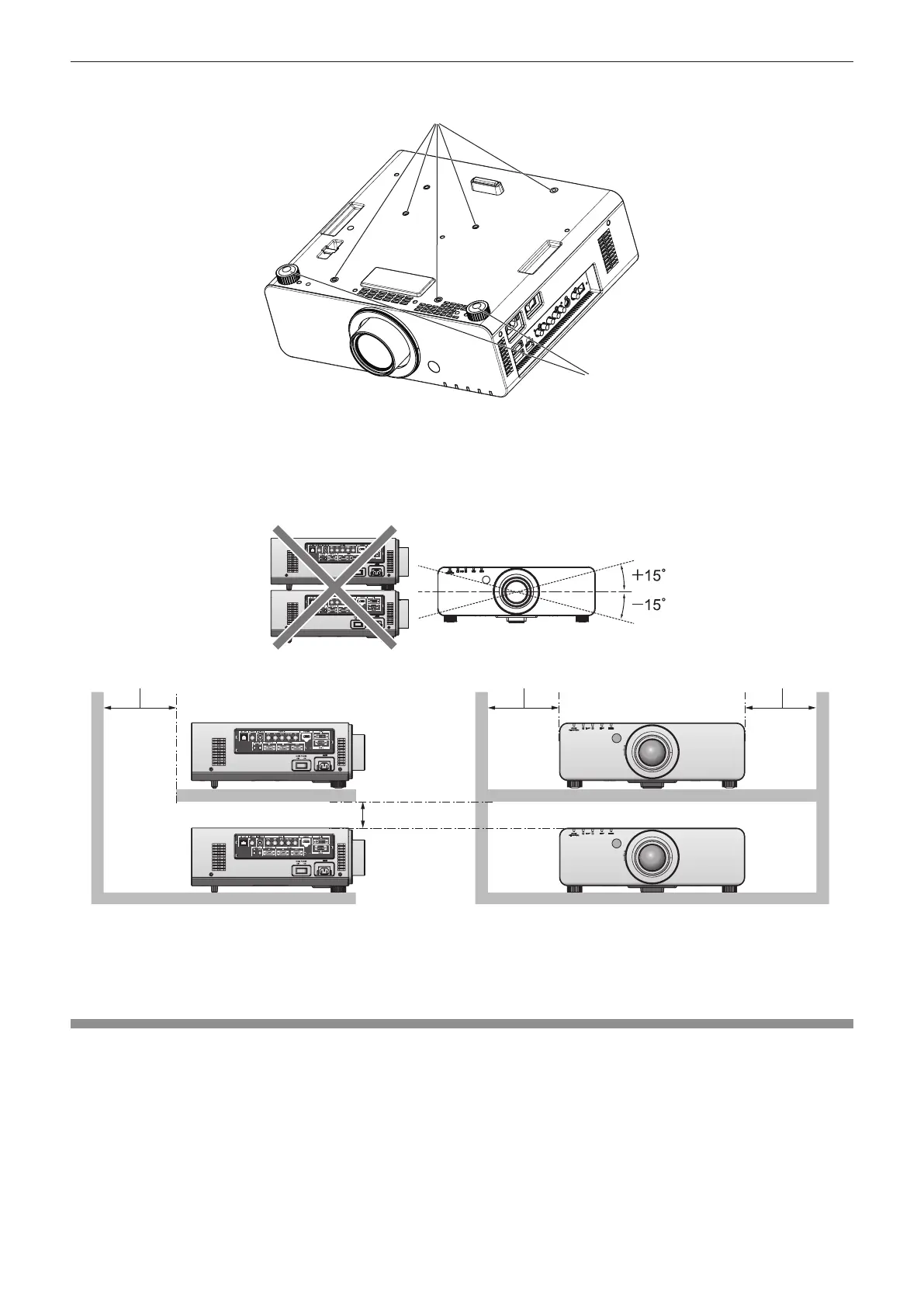 Make a clearance of at least 20 mm (0.8") between the projector bottom and setting surface by inserting spacers (metallic) etc. between