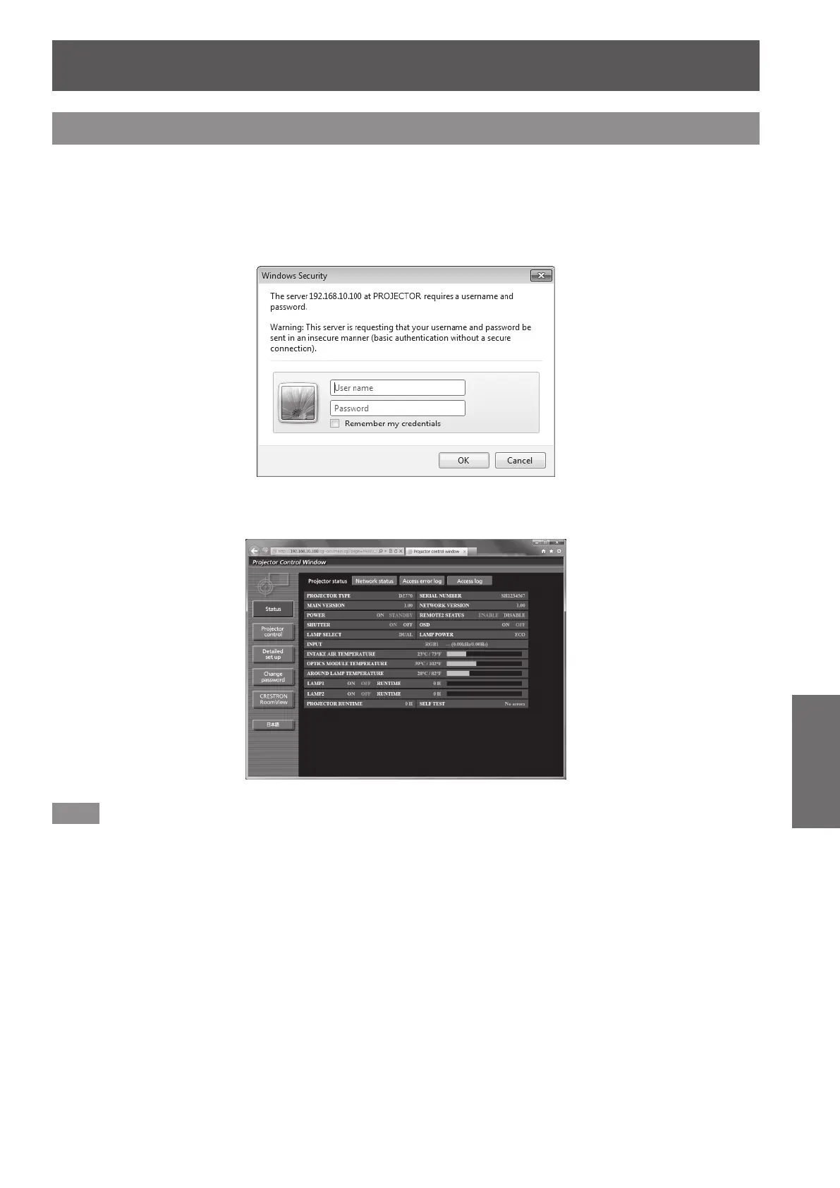 The administrator rights allows to use all functions. The user rights allow use of [Projector status](
