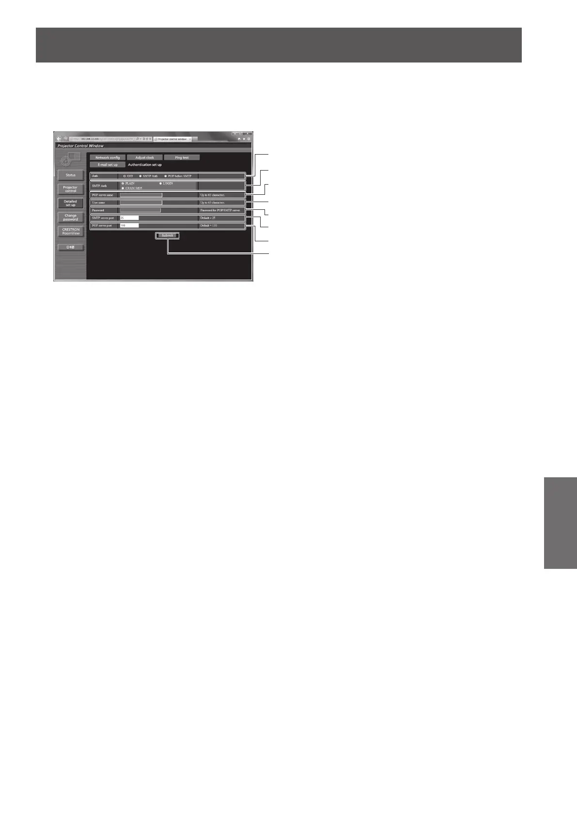 You can set the authentication items when POP authentication or SMTP authentication is necessary to send