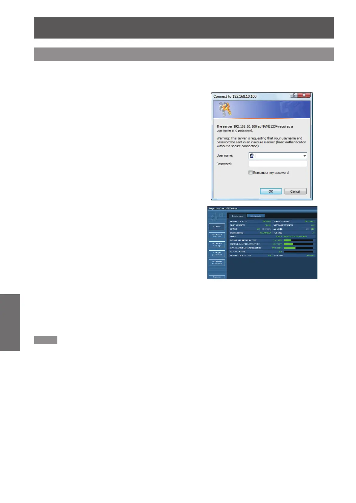 Enter the IP address set by the projector into the URL input eld of the Web browser.2 )