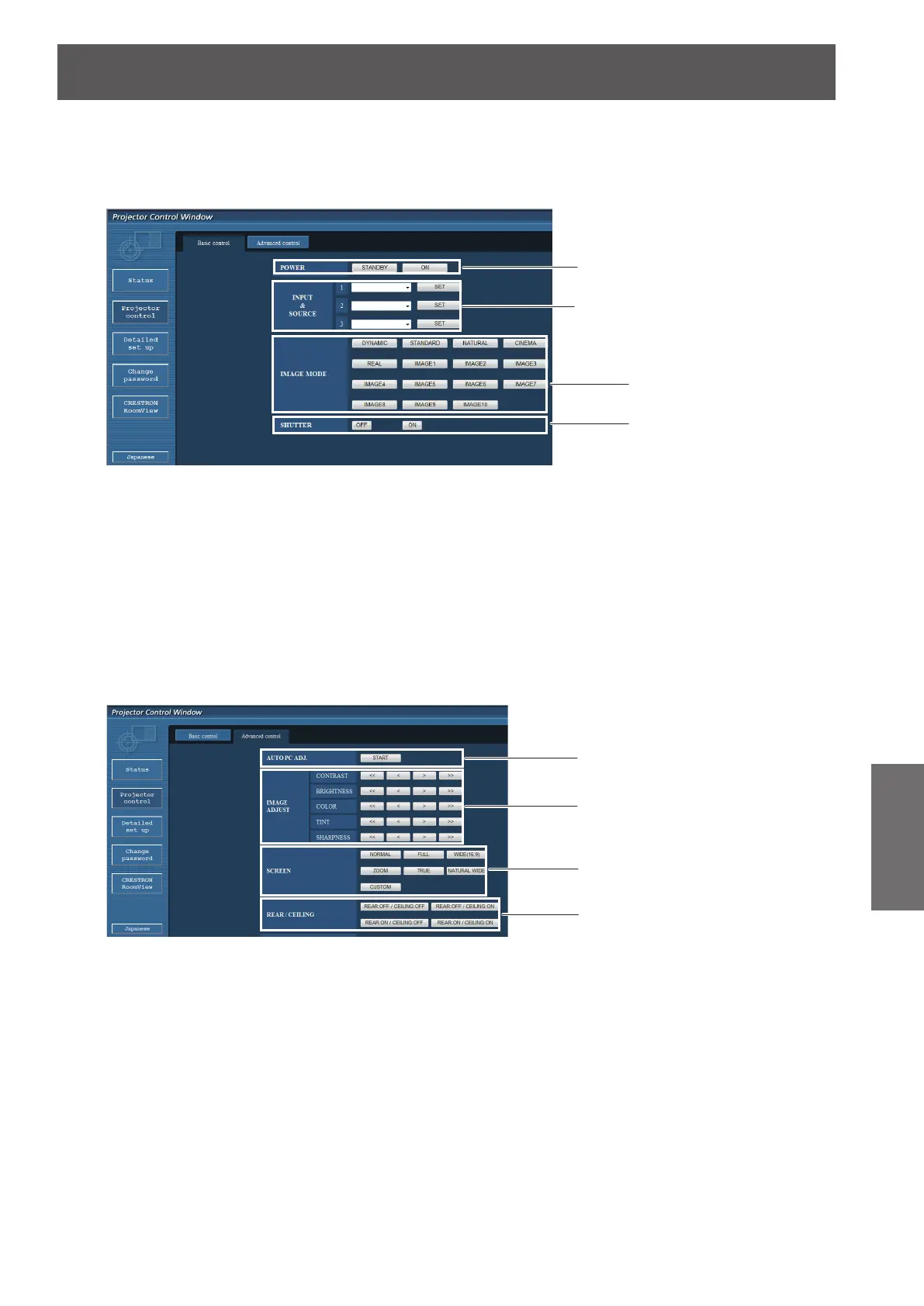 Click [Projector control], then [Advanced control] to display the Detail control page.