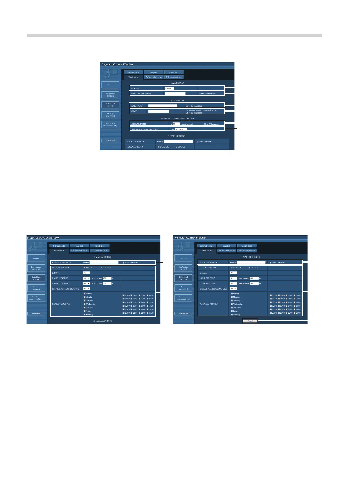 When there is a problem or the runtime of a lamp reaches a set value, an E-mail can be sent to preset E-mail addresses (up to two