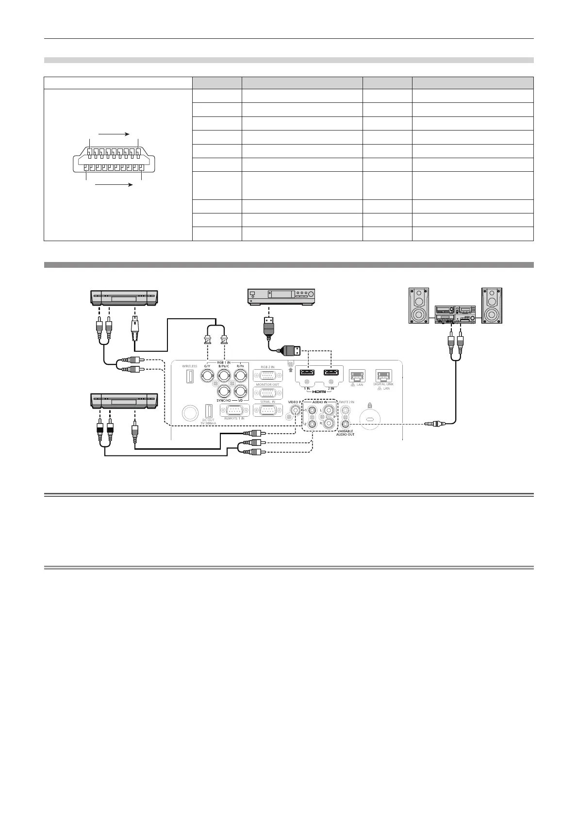 <HDMI 1 IN> terminal/<HDMI 2 IN> terminal pin assignments and signal names