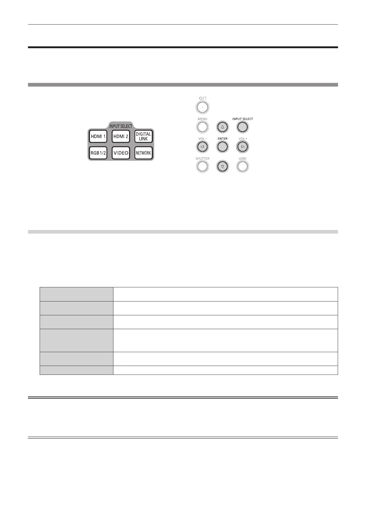 The input for projection can be switched directly by pressing the input selection button on the remote control.