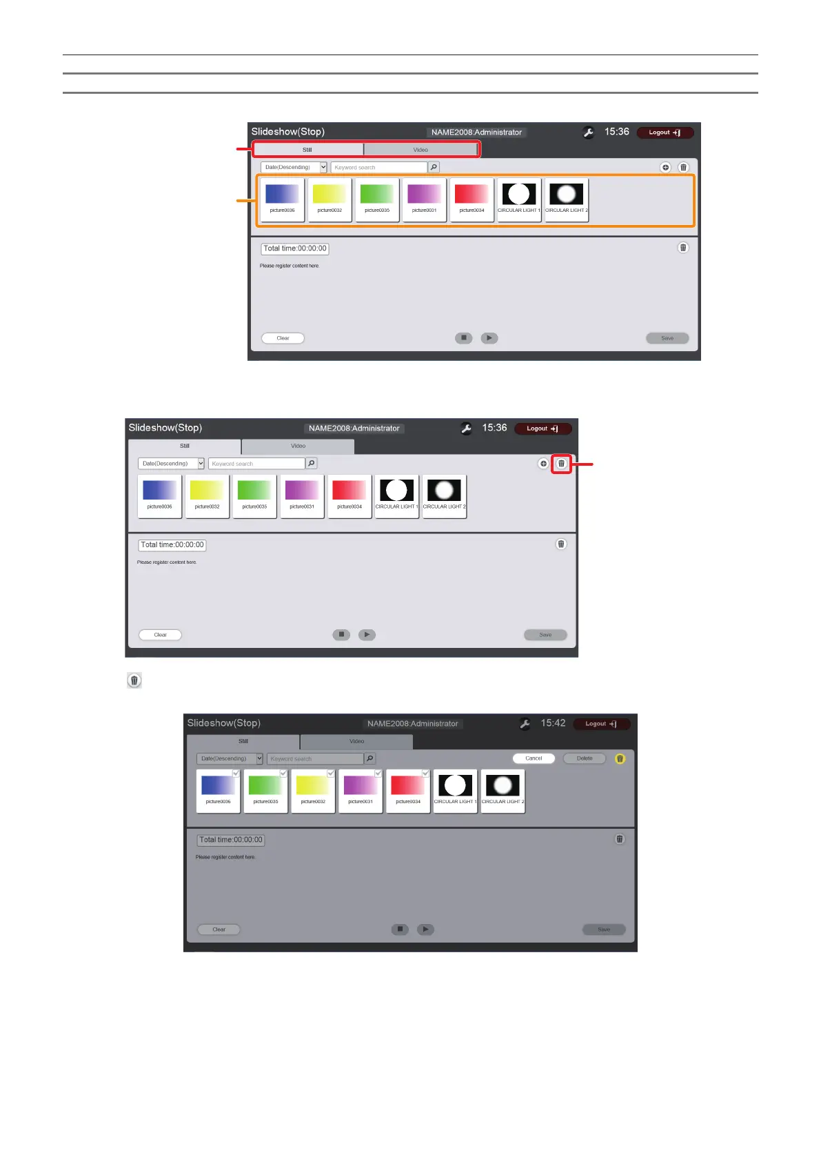 1) Click the tab of the content to be deleted from the “Content selection tab” ([Still] or [Video]).