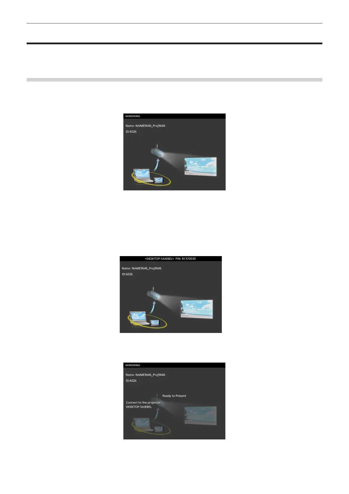 f Check the projector name and ID of the projector displayed on the MIRRORING idle screen, and then