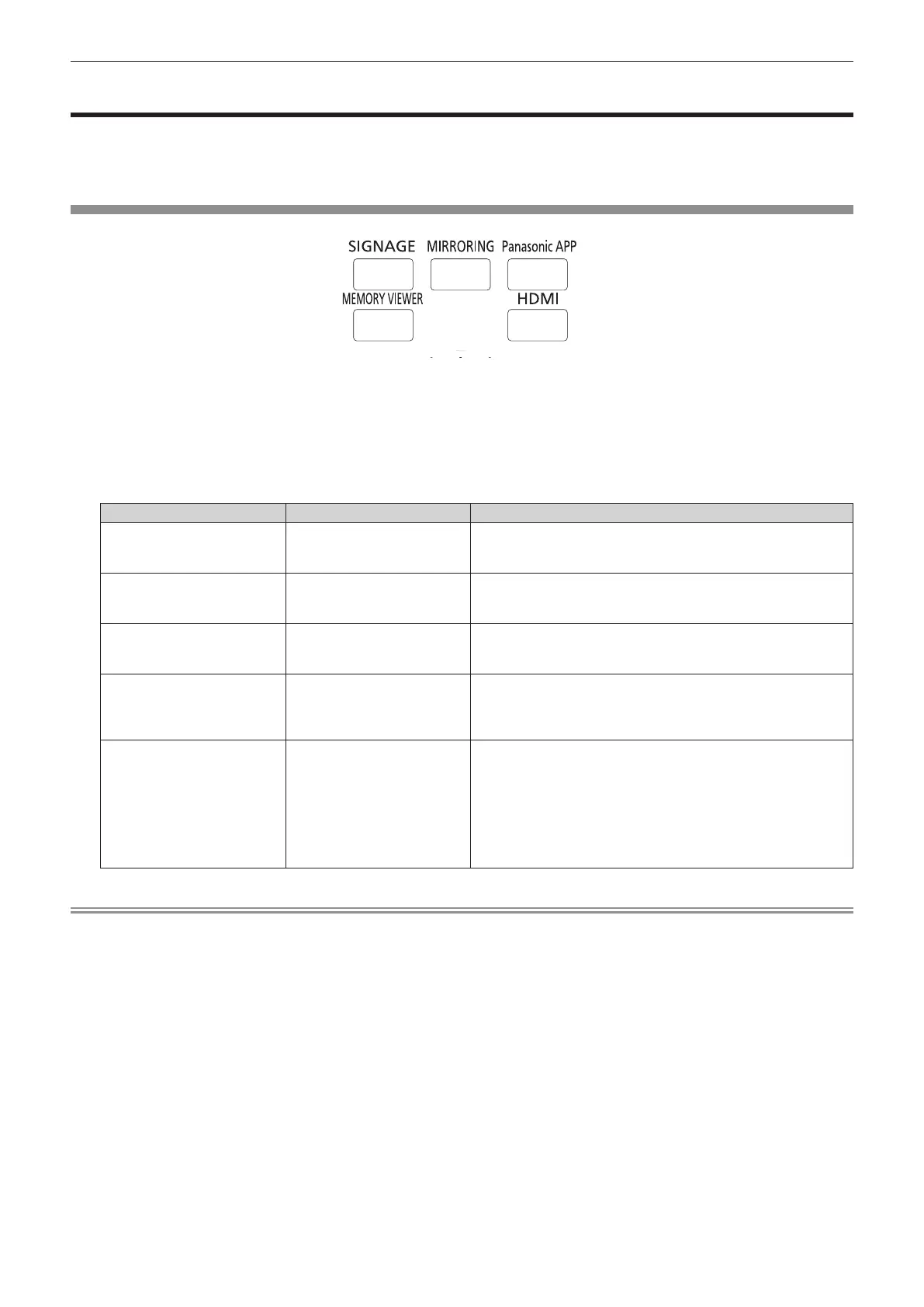 1) Press the <HDMI>, <MEMORY VIEWER>, <MIRRORING>, <Panasonic APP>, or <SIGNAGE> button on