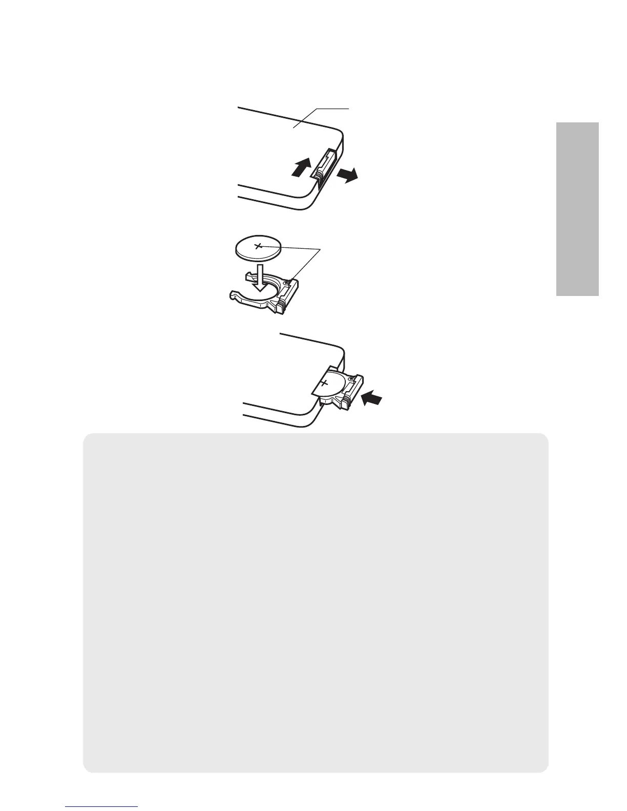 B Remove the battery if not using the remote control unit for long periods.
