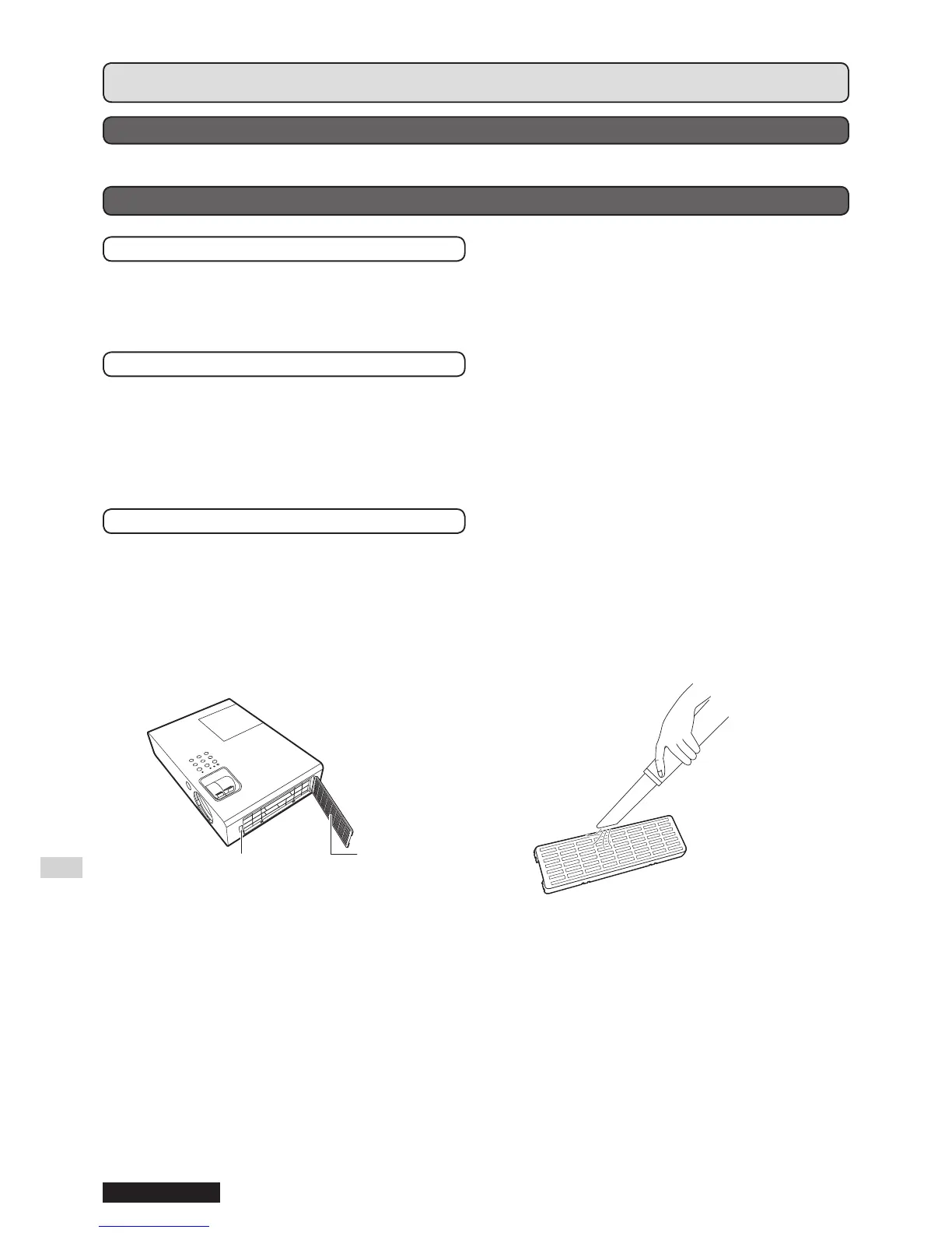 Do not use the projector without attaching the air lter. Otherwise, it will suck in dirt and dust which can cause malfunction.•
