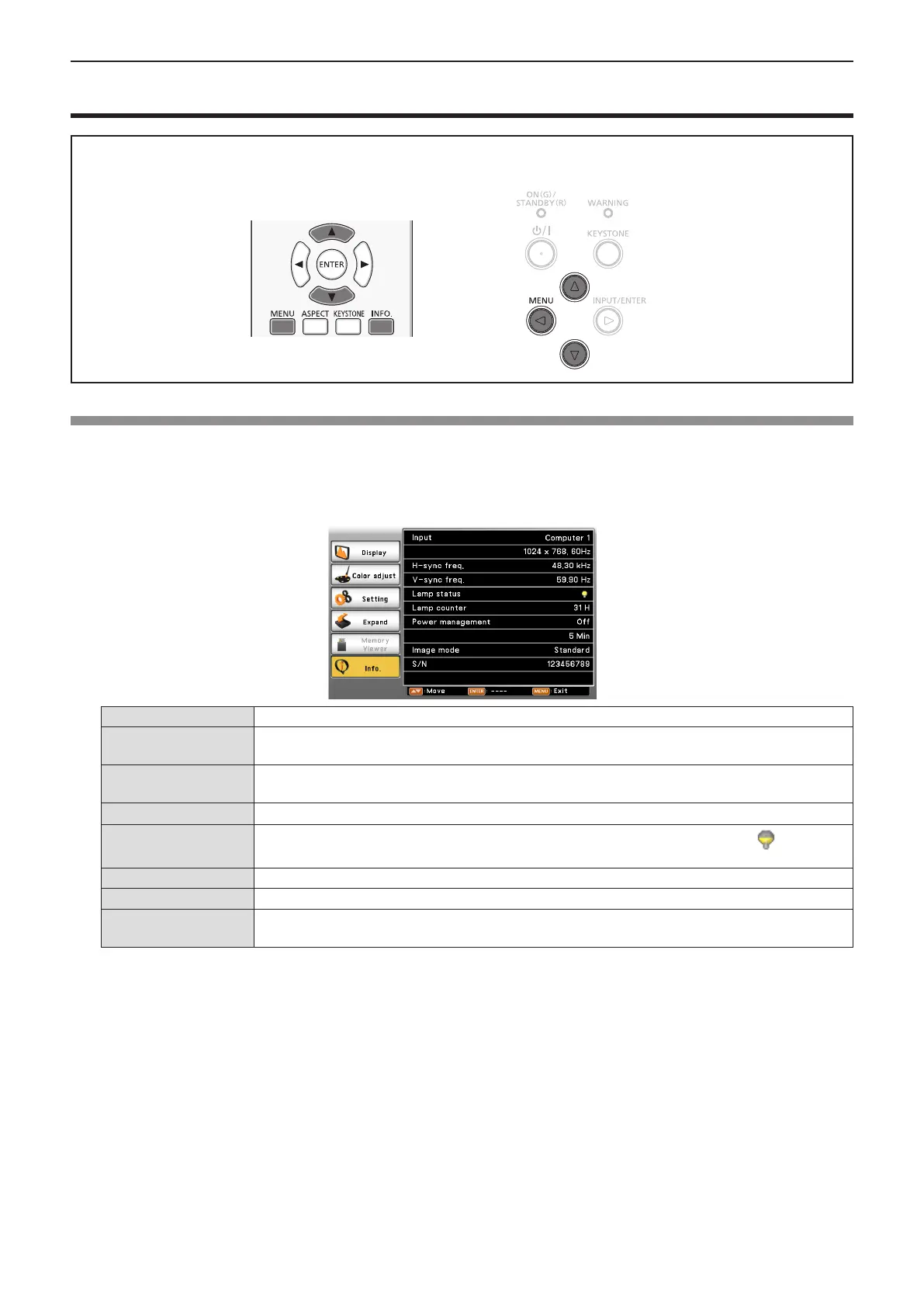 The horizontal frequency of the input signal is displayed in kHz. [- - - - ] is displayed when no
