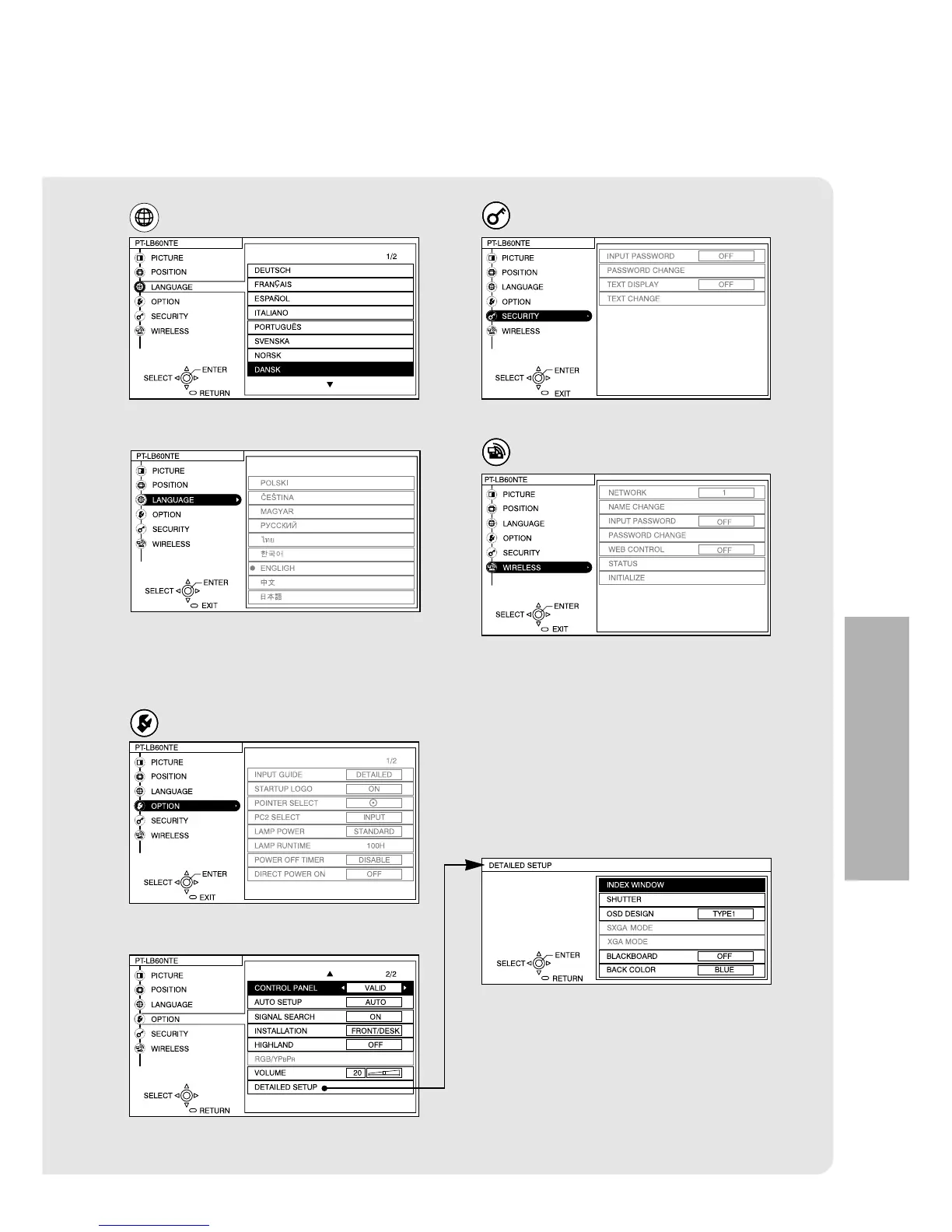 LANGUAGE menu (page 48) SECURITY menu (page 54)