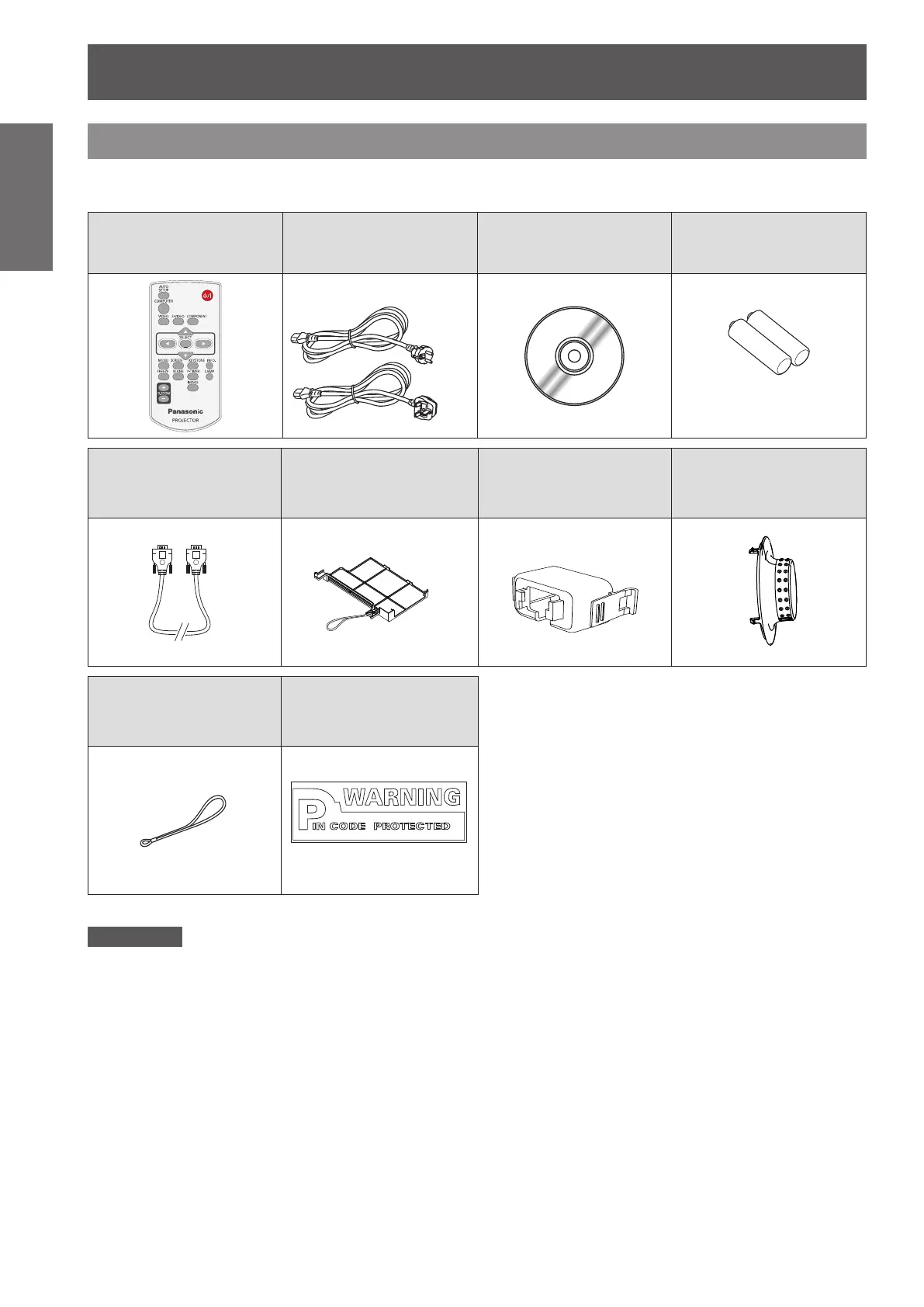 Make sure the following accessories are provided with your projector. Numbers in the brackets ( ) show the