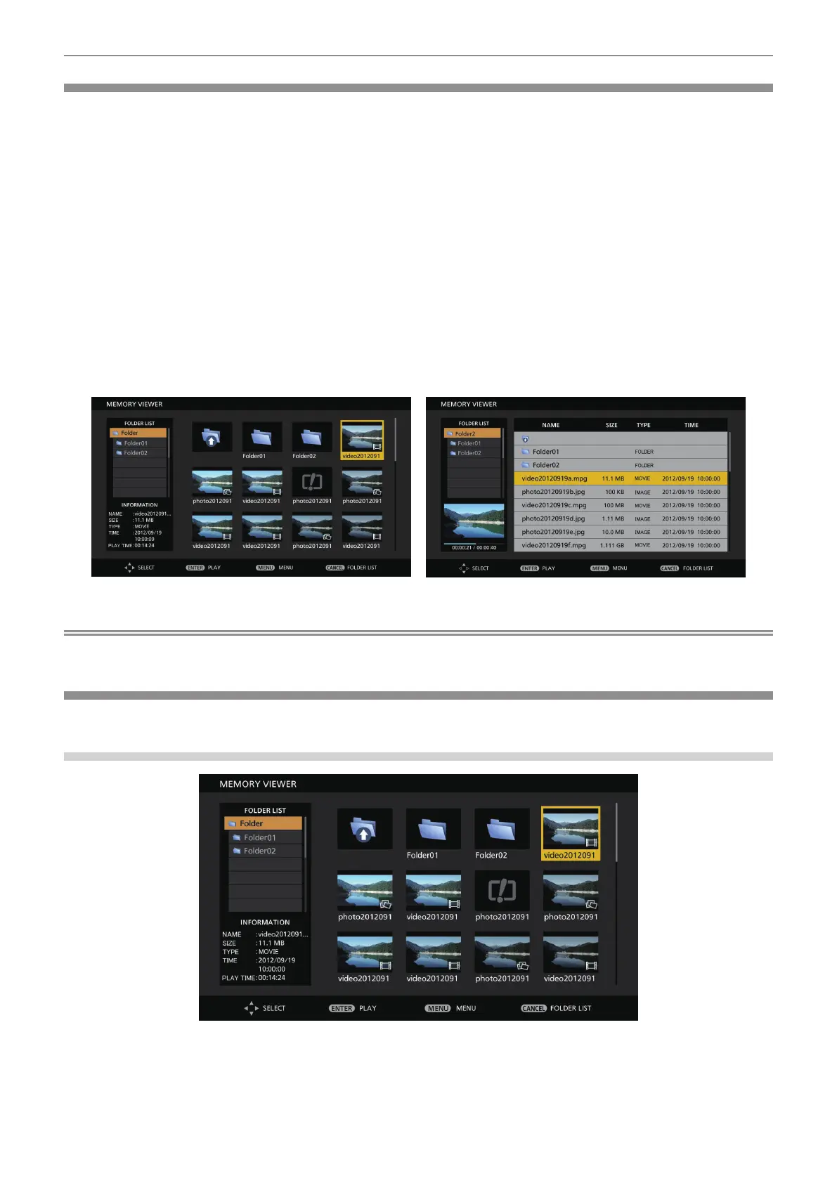 f Display method (displaying in thumbnail view or list view) in the Memory Viewer screen can be set in the [NETWORK/USB] menu →