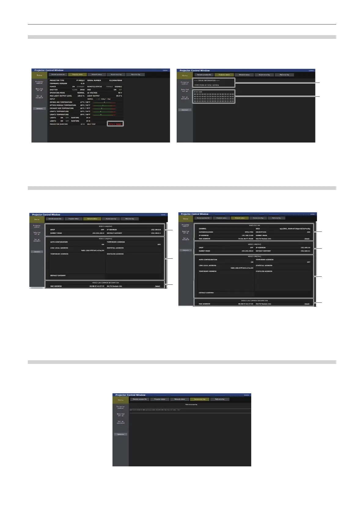 When [Error (Detail)] or [Warning (Detail)] is displayed in the [SELF TEST] display eld of the [Projector status]