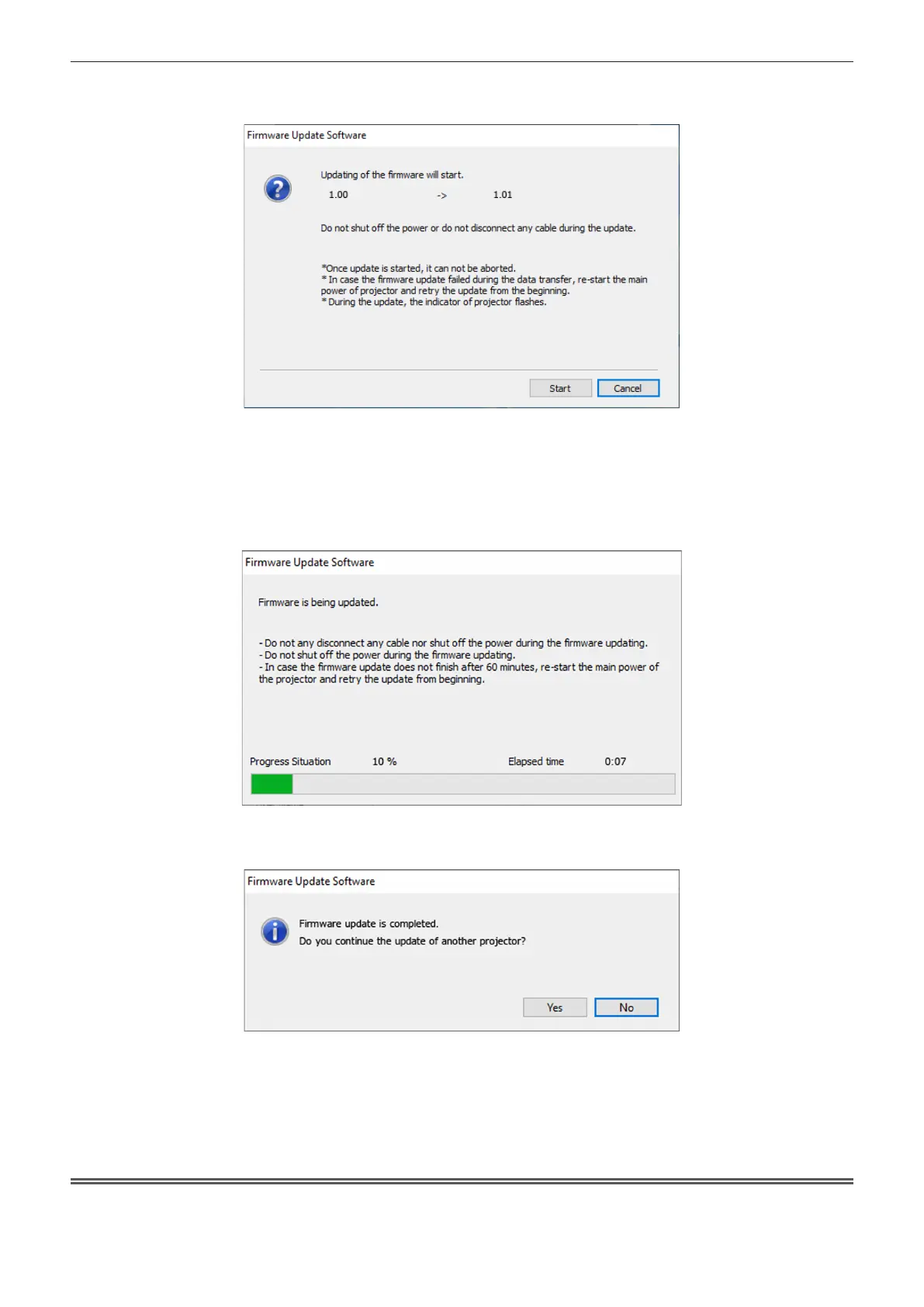 f To continue to update the rmware of another projector, click [Yes]. The connection setting screen in Step