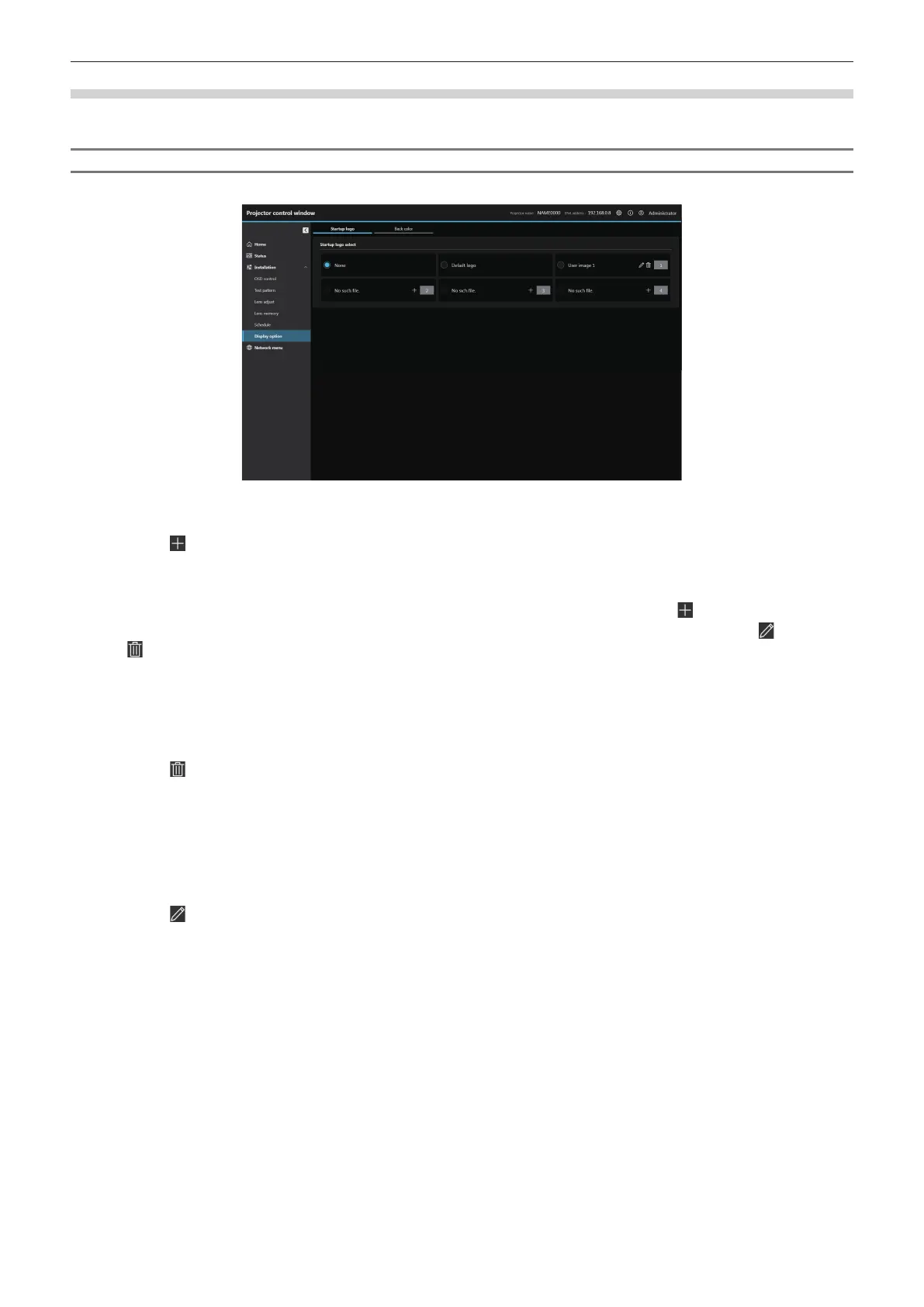 Set the display of startup logo. You can also register, delete or edit the user images.